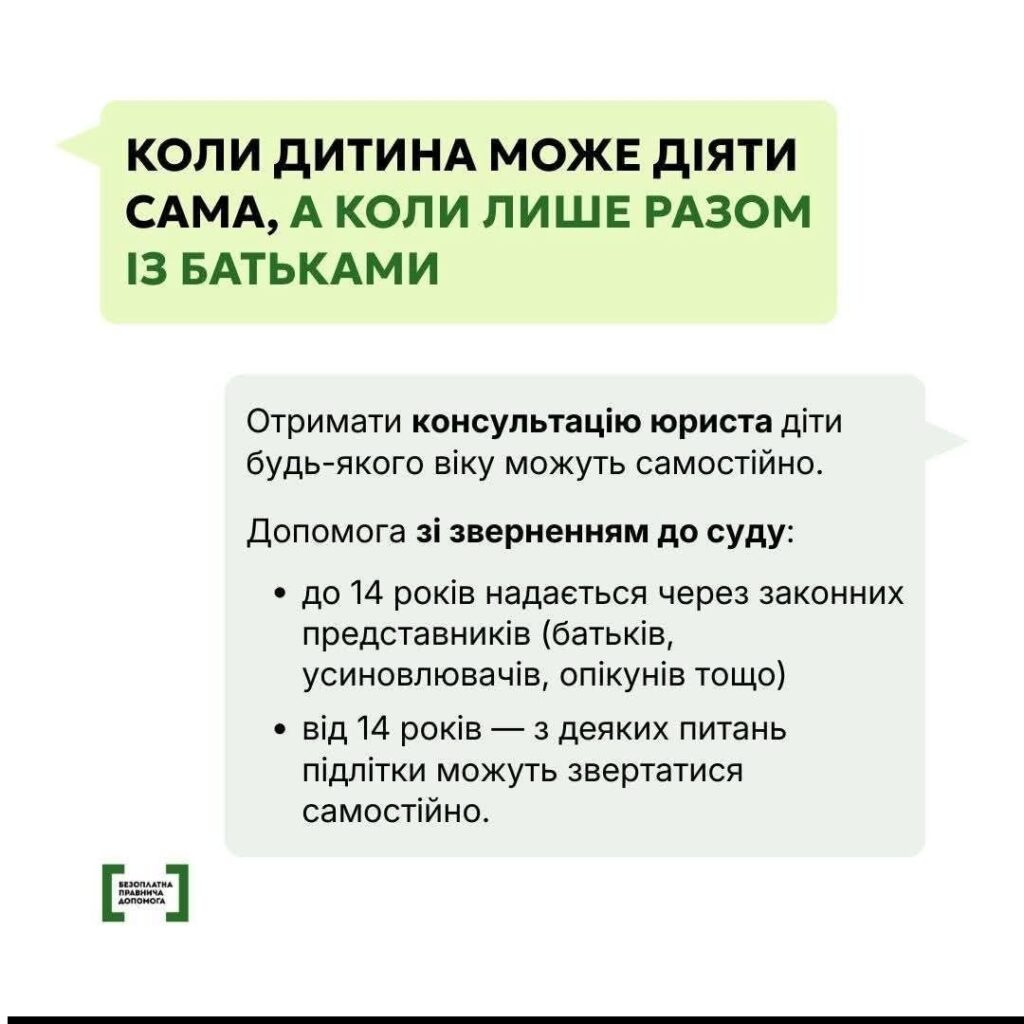 👉 З якими юридичними питаннями можуть стикатися діти, як отримати допомогу юриста чи адвоката безоплатно та з якого віку можна звертатися самостійно — у картках, підготовлених системою надання безоплатної правничої допомоги (БПД).