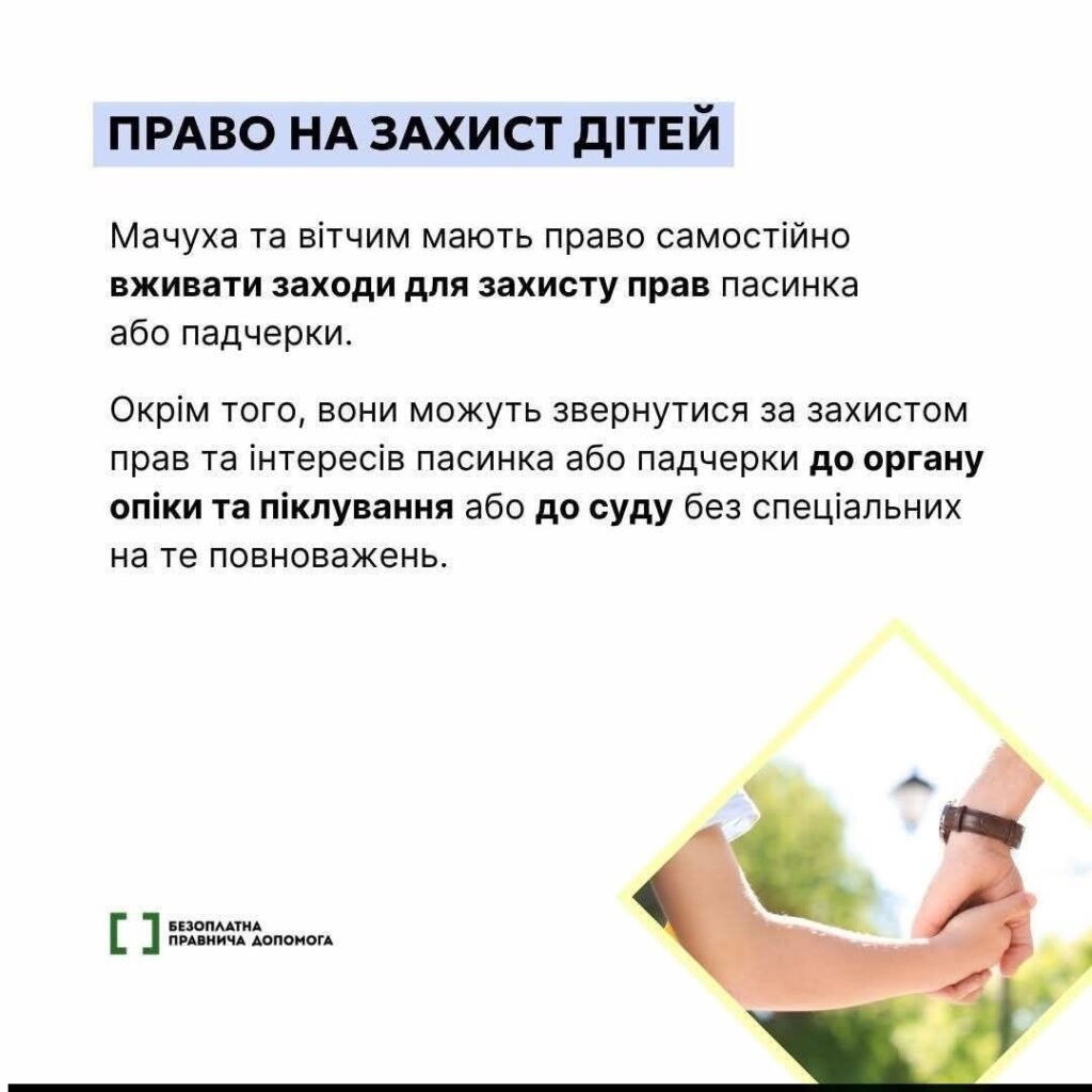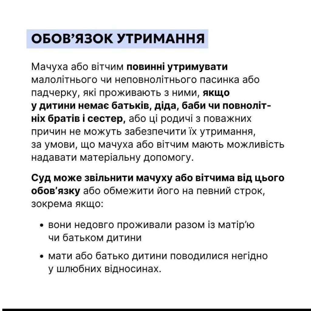 📌 У сім’ях, де є мачуха або вітчим, часто виникають запитання про права та обов’язки щодо дітей. Що передбачає закон про виховання, захист прав та утримання — розповідаємо у картках.